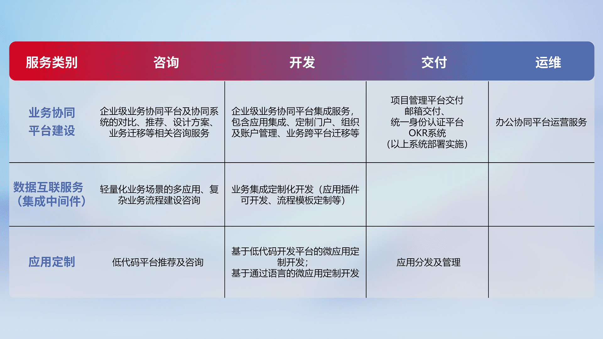 针对钉钉、、、企微、、、IDaas等平台级产品提供产品的规划、、、方案、、交付、、、、定制化开发等服务,,,实现如统一协同办公、、智能客户服务、、混合会议管理、、智能数据查询、、等业务场景,,实现数字化转型。。