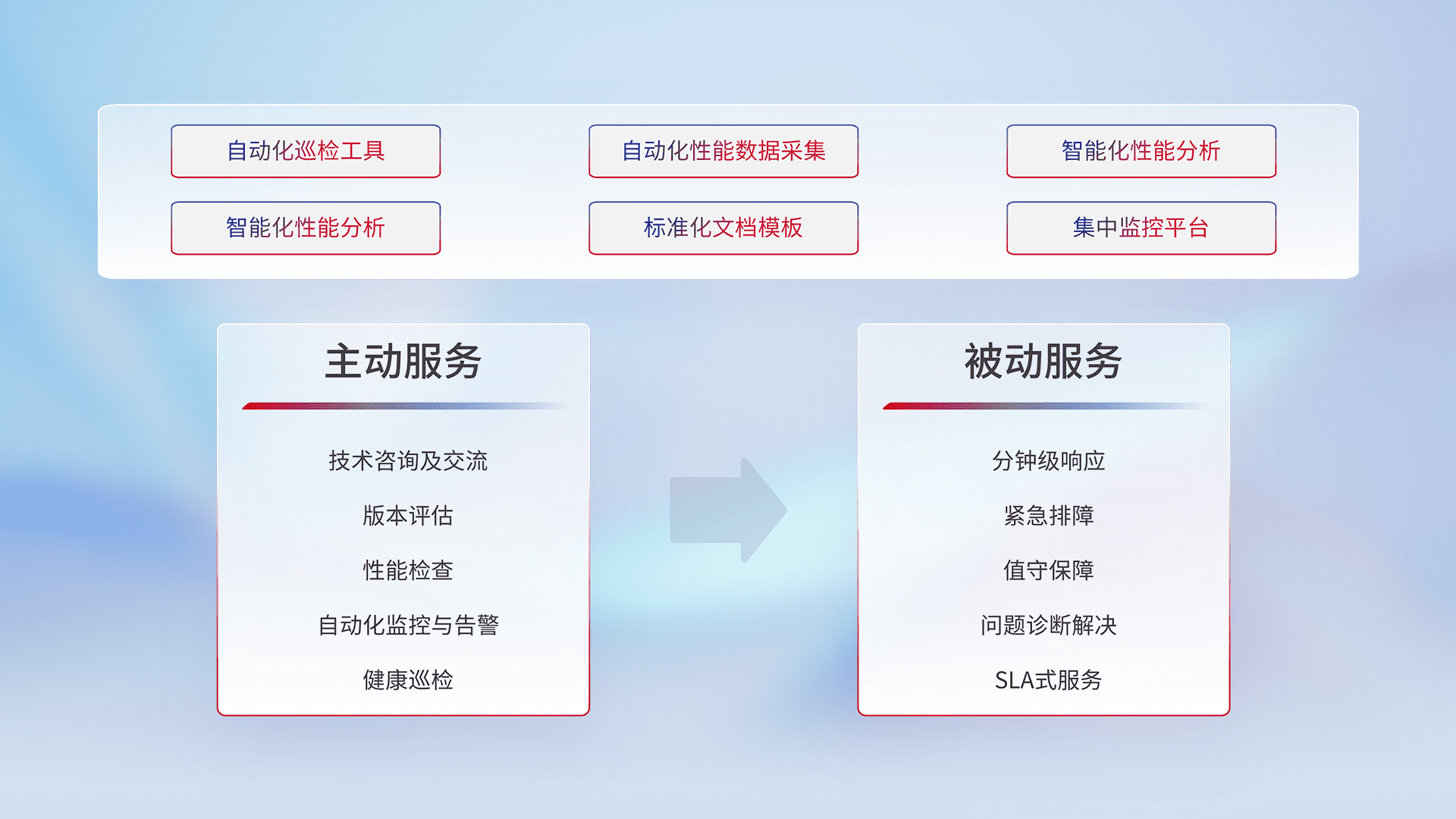 智能化工具和标准化文档,,,保障服务质量,,,提供主动服务(包含技术咨询、、、版本评估、、性能检查、、、、自动化监控与告警、、、、健康巡检)和被动服务包含(分钟级响应、、、紧急排障、、、、值守保障、、、问题诊断解决、、SLA服务)。。。。